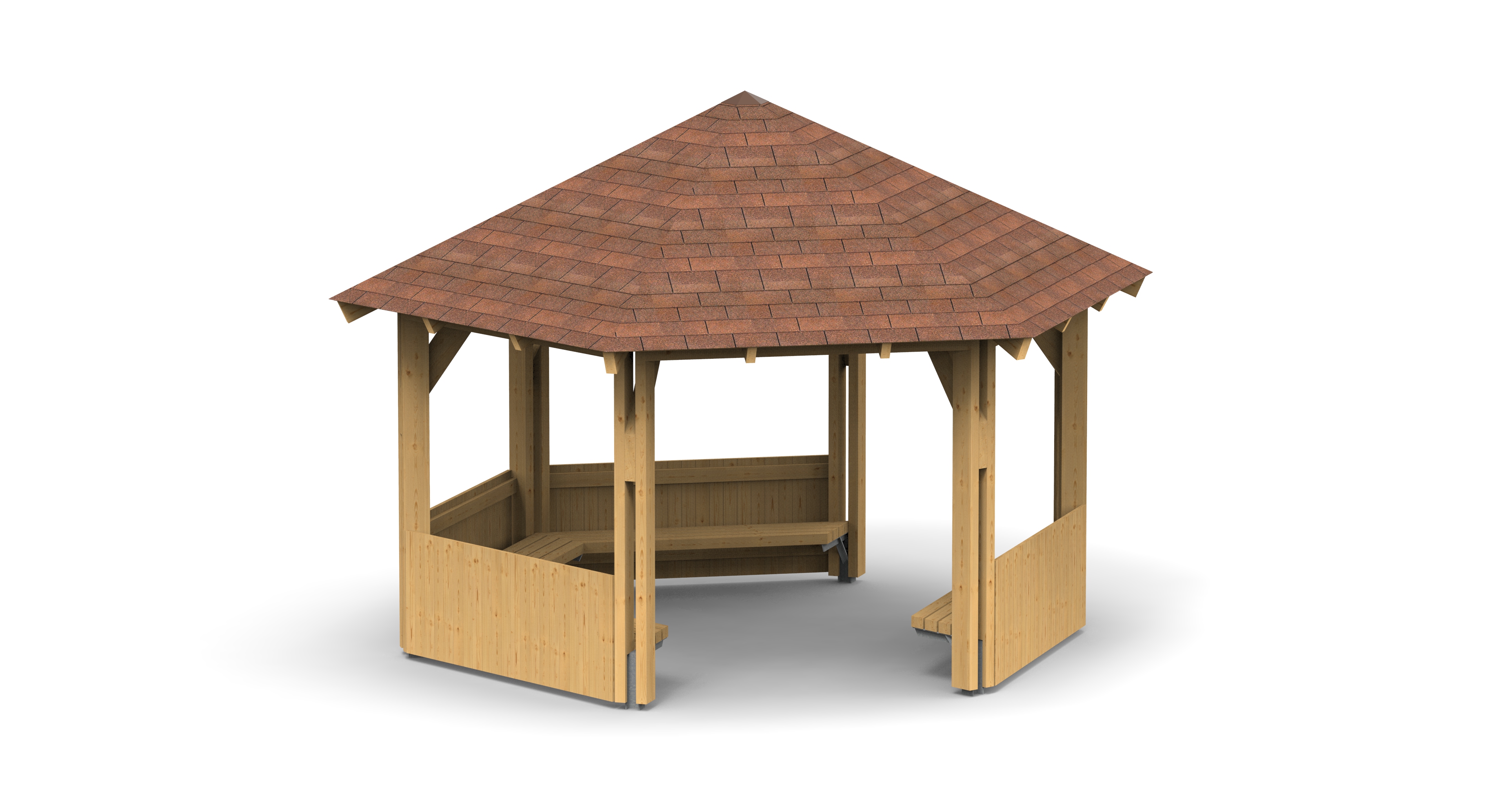 Šestiboký altán průměru 4,5 m. Krytina z asf. šindele. Standardní provedení zahrnuje 4 zástěny s lavicí. Jiná provedení jsou na přání možná.