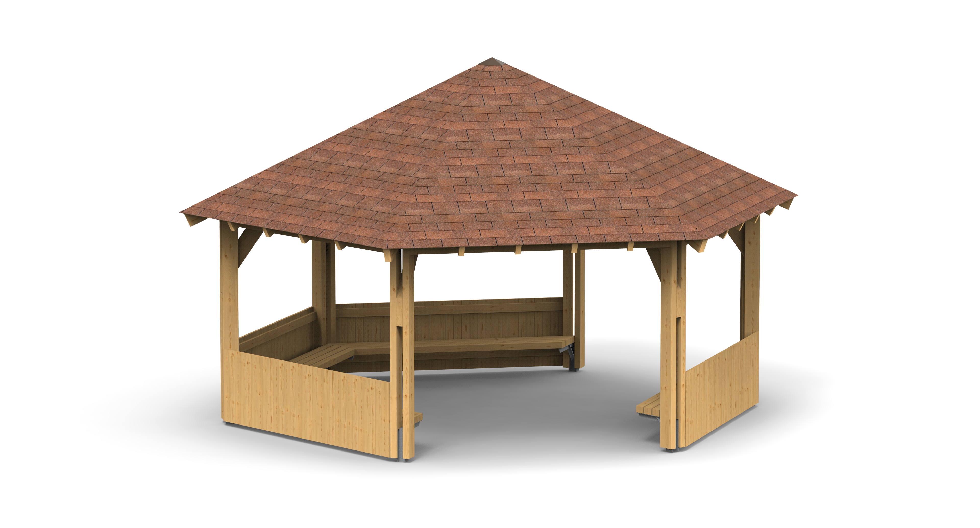 Šestiboký altán průměru 6 m. Krytina z asf. šindele. Standardní provedení zahrnuje 4 zástěny s lavicí. Jiná provedení jsou na přání možná.