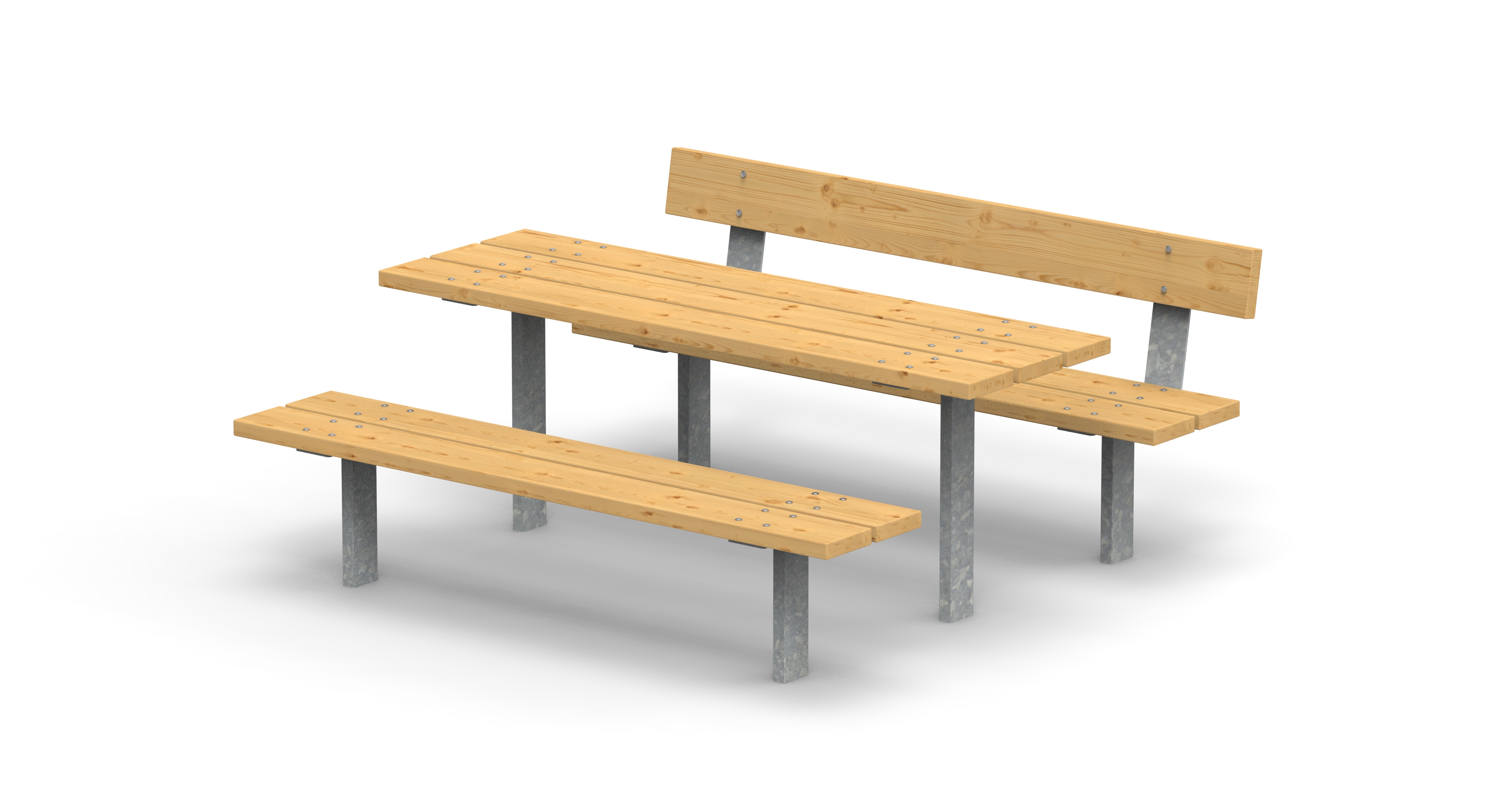 Pevně zabudovaná souprava stolu, lavice a lavice bez opěradla. Jednoduchá údržba, odolná proti vandalizmu.