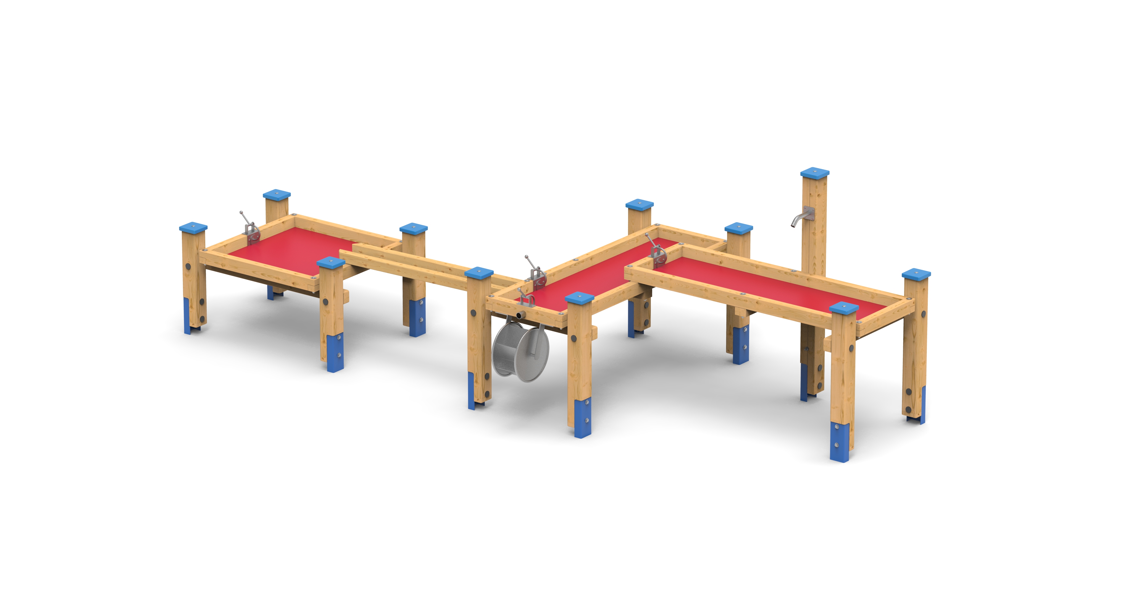 Větší kombinace se třemi vanami, pumpu, vodním kolem a korýtkem.