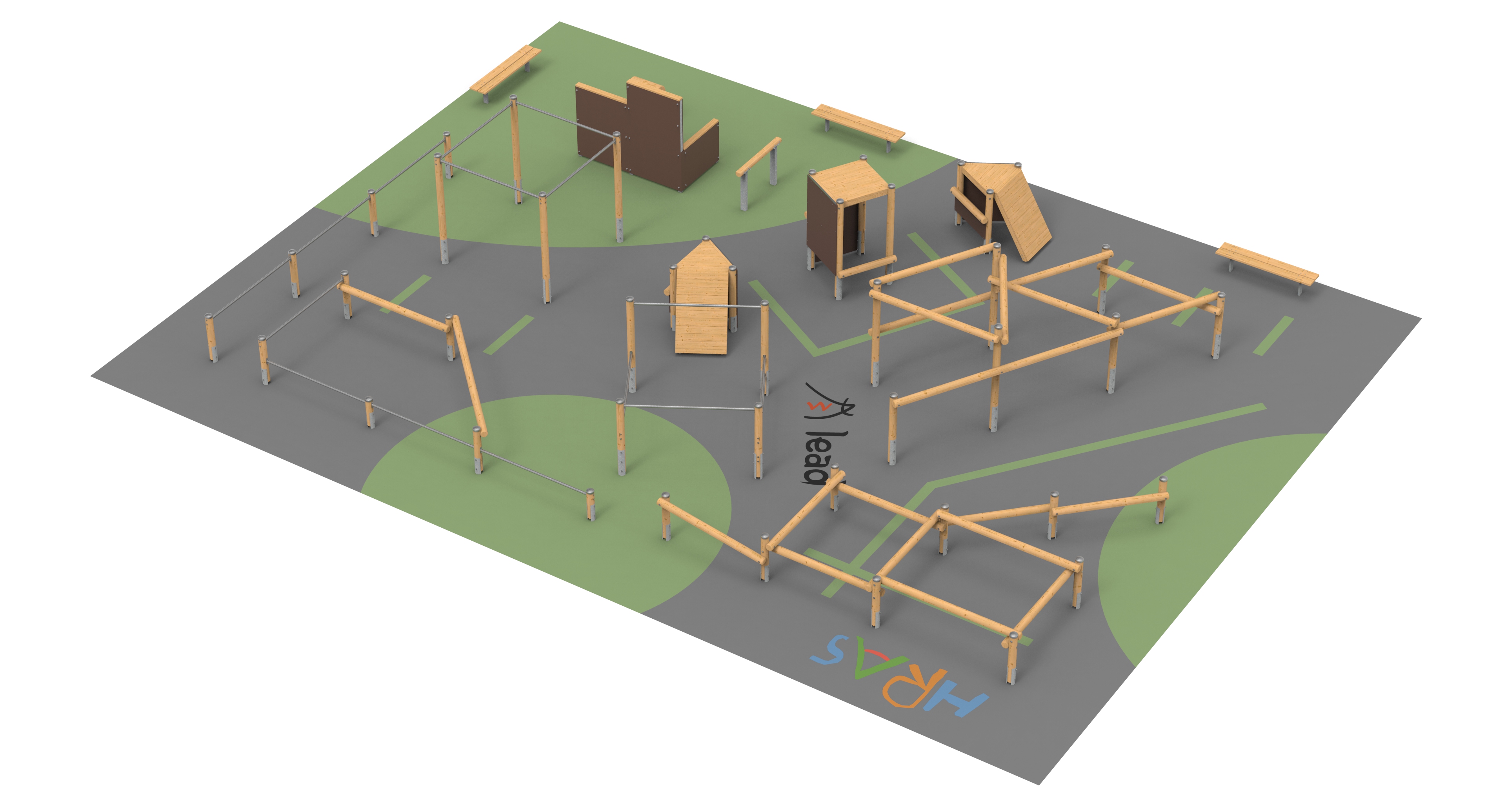 Parkourové hřiště HRAS 300 potřebuje plochu 15 x 20 m a nabízí bohaté vyžití při tréninku skoků, odrazů, balancování apod. Oblé plochy konstrukcí tvoří masivní frézovaná kulatina průměru 140 mm, nerezové hrazdy jsou z trubky 50 mm.